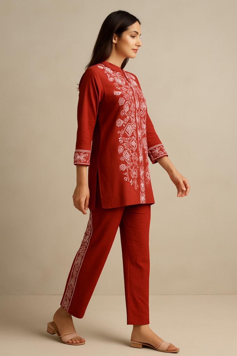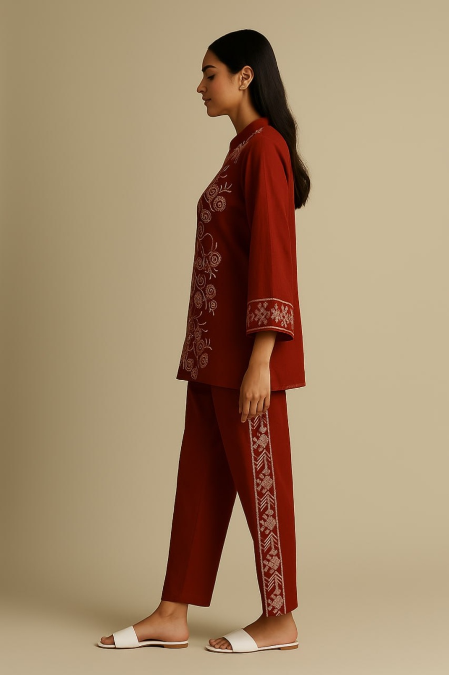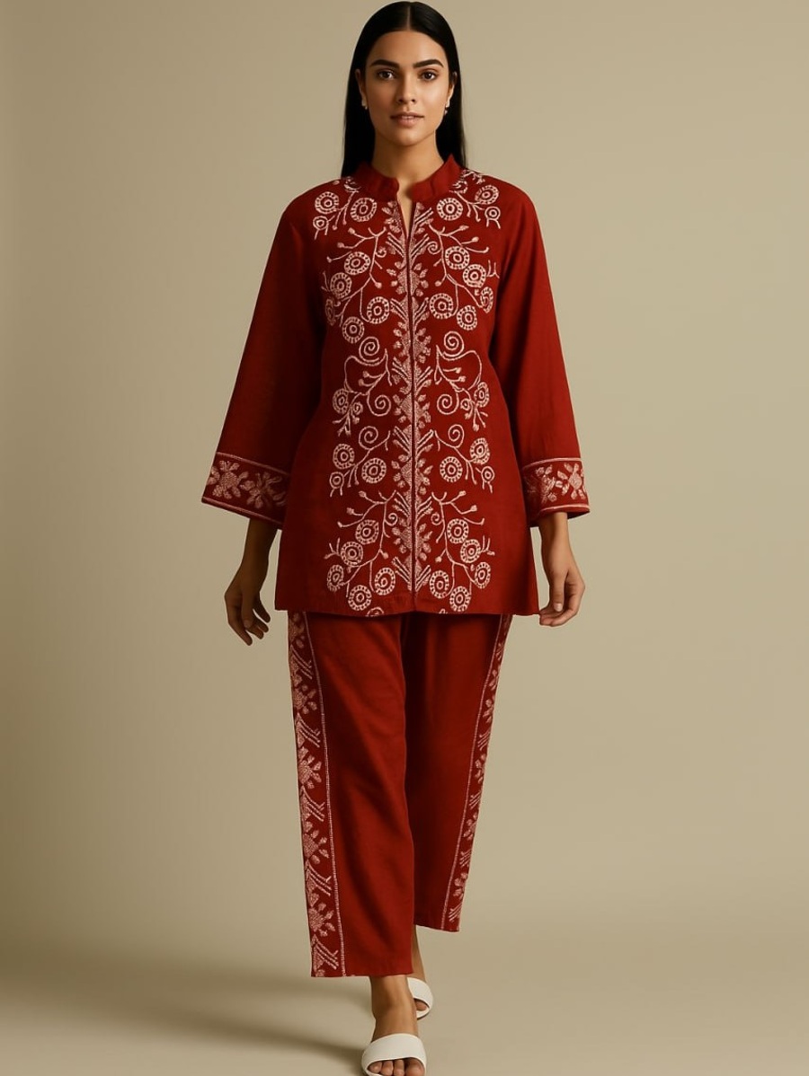 MODERN RAYON EMBROIDERY WORK CO-ORD SET ORANGE