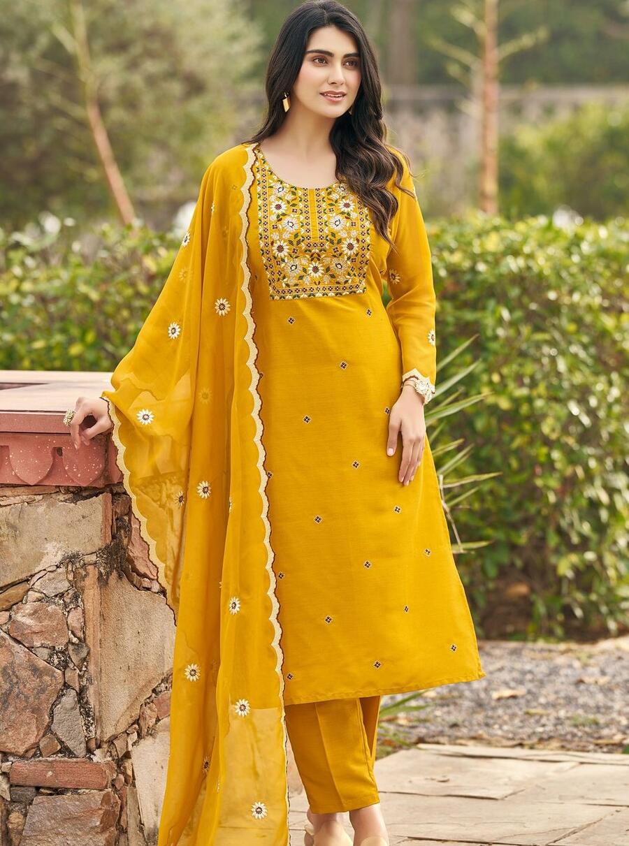 MODERN RAYON EMBROIDERY WORK TOP BOTTOM WITH DUPATTA YELLOW