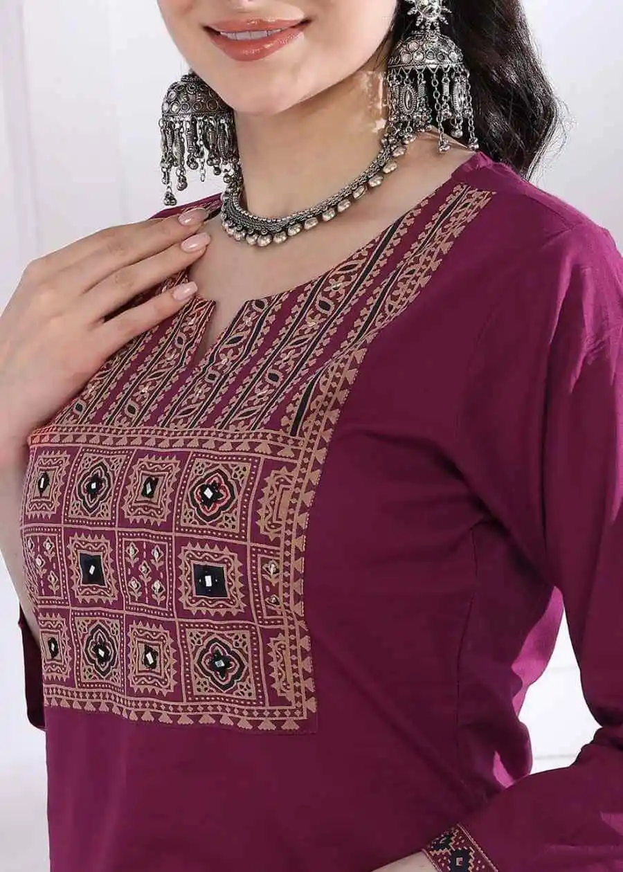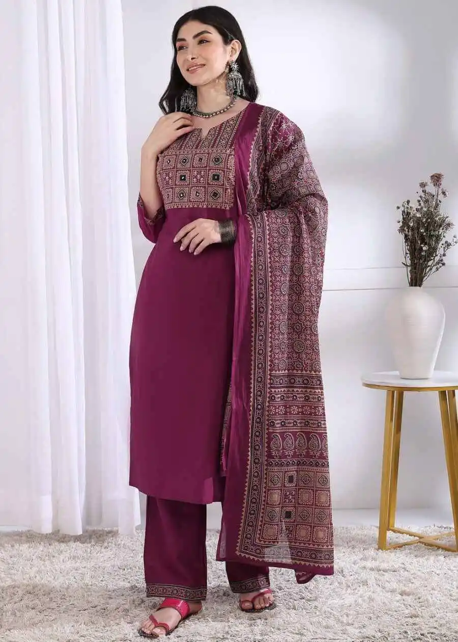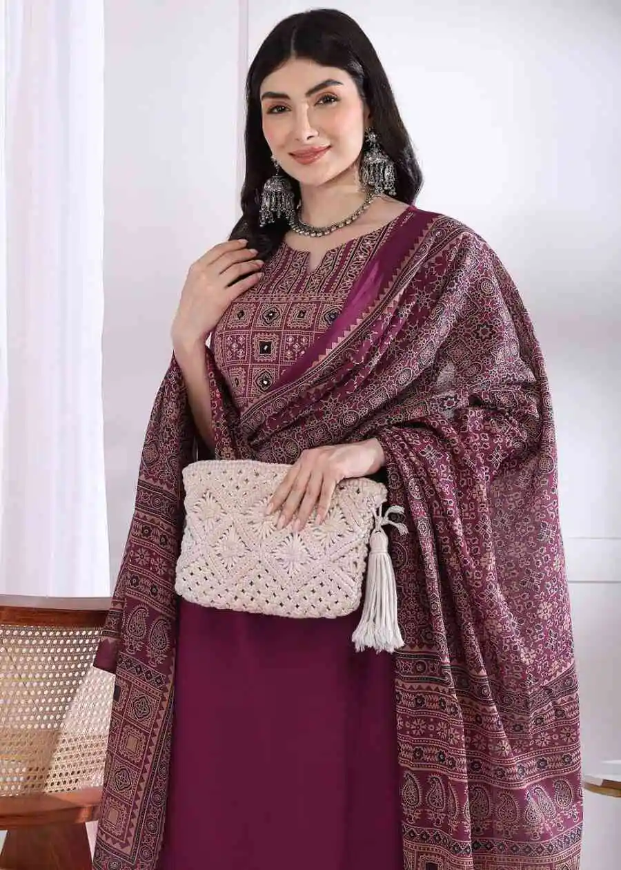 MODERN RAYON PRINTED WORK TOP BOTTOM WITH DUPATTA WINE