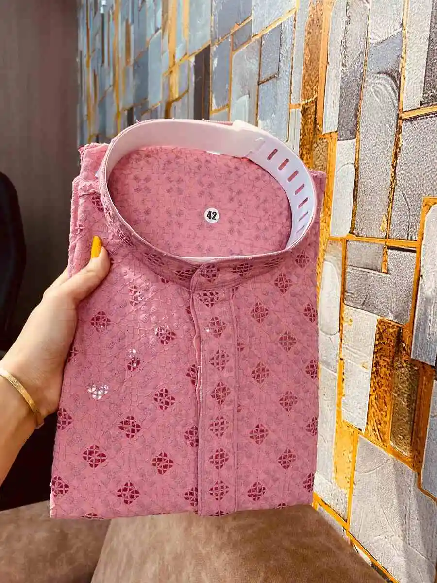 MODERN RAYON THREAD SEQUENCE WORK MEN’S KURTA PAYJAMA BABY PINK