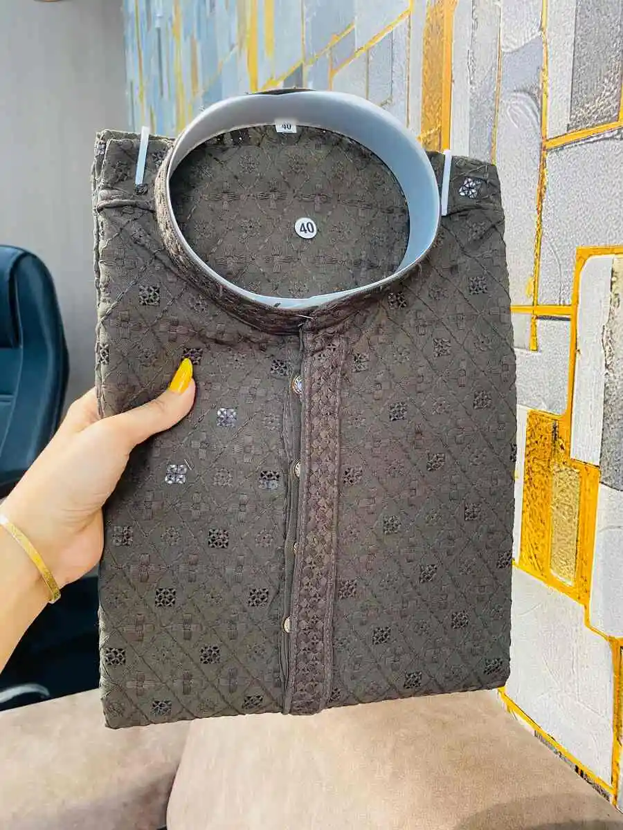 MODERN RAYON THREAD SEQUENCE WORK MEN’S KURTA PAYJAMA GREY