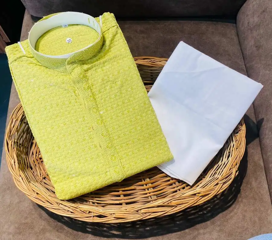 MODERN RAYON THREAD SEQUENCE WORK MEN’S KURTA PAYJAMA LEMON