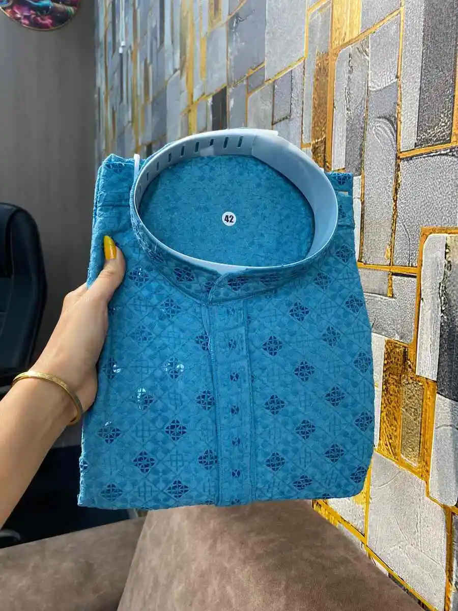 MODERN RAYON THREAD SEQUENCE WORK MEN’S KURTA PAYJAMA RAMA