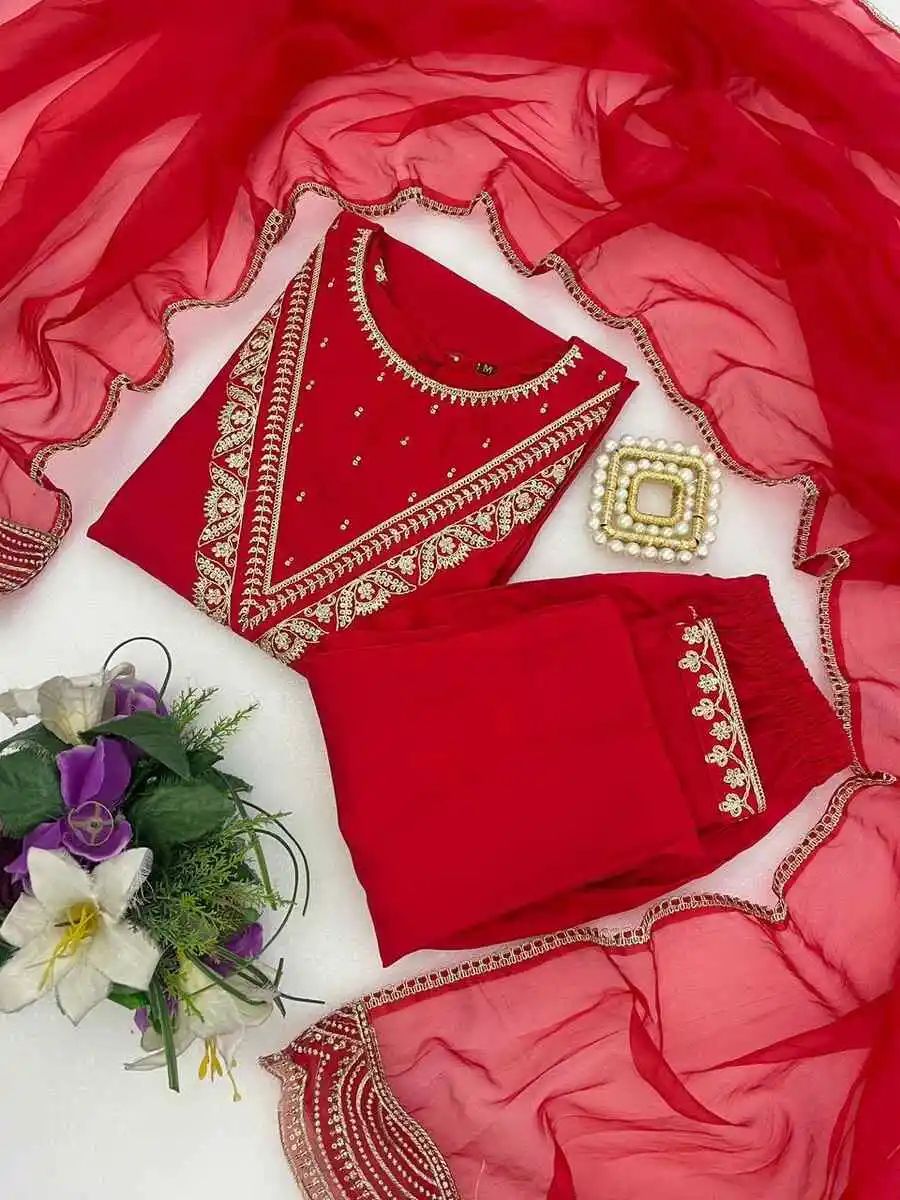 MODERN ROMAN EMBROIDERY WORK TOP BOTTOM WITH DUPATTA RED