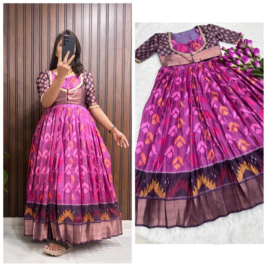 MODERN SILK DIGITAL PRINT AND JACQUARD ZARI WORK CONTRAST BORDER GOWN WITH JACKET PURPLE