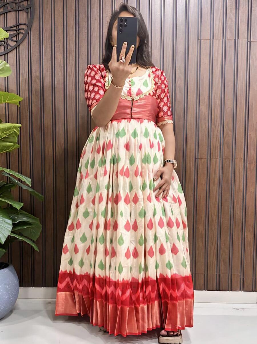 MODERN SILK DIGITAL PRINT AND JACQUARD ZARI WORK CONTRAST BORDER GOWN WITH JACKET RED