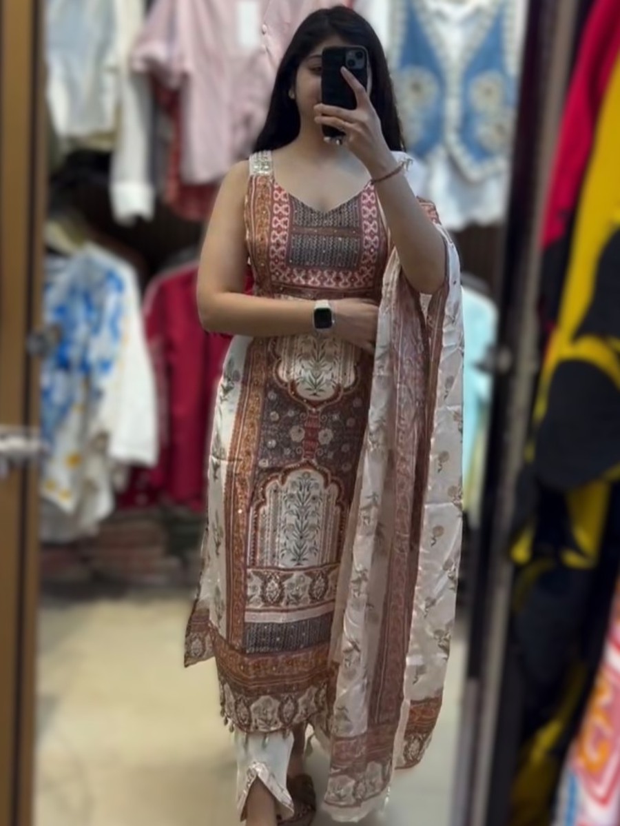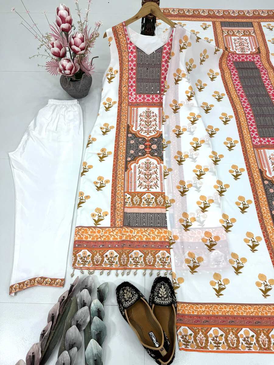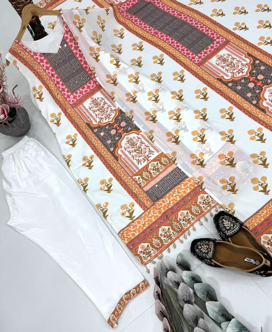 MODERN SILK DIGITAL PRINT WITH REAL MIRROR HAND WORK AND FANCY LACE WORK TOP BOTTOM WITH DUPATTA WHITE