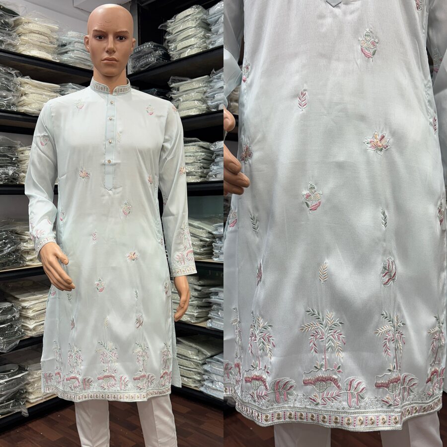 MODERN SILK EMBROIDERY SEQUENCE WORK MEN’S KURTA PAYJAMA SKY