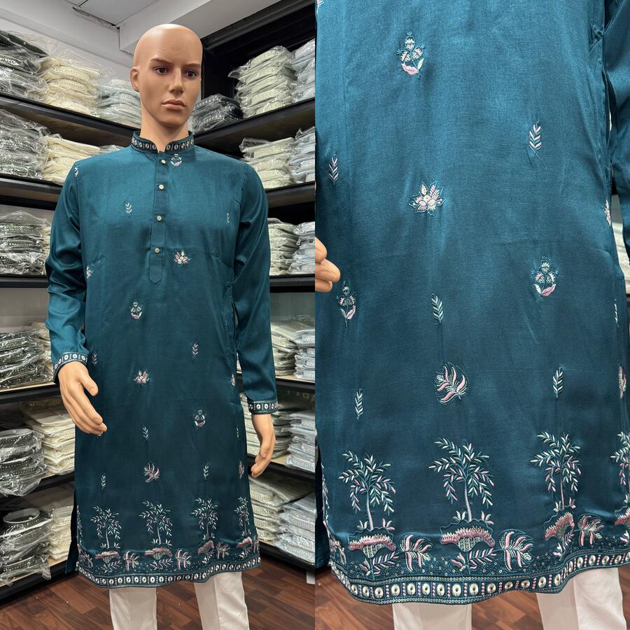 MODERN SILK EMBROIDERY SEQUENCE WORK MEN’S KURTA PAYJAMA TEAL