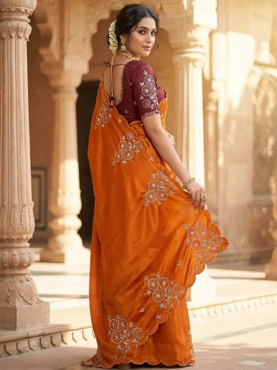 MODERN SILK HANDWORK CUT DANA WITH ZARKAN DIAMOND CUT WORK BORDER WORK SAREE WITH UNSTITCHED BLOUSE ORANGE