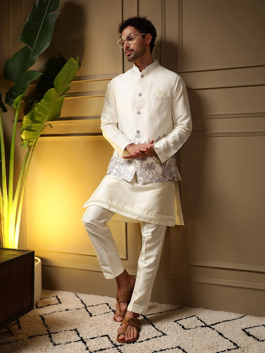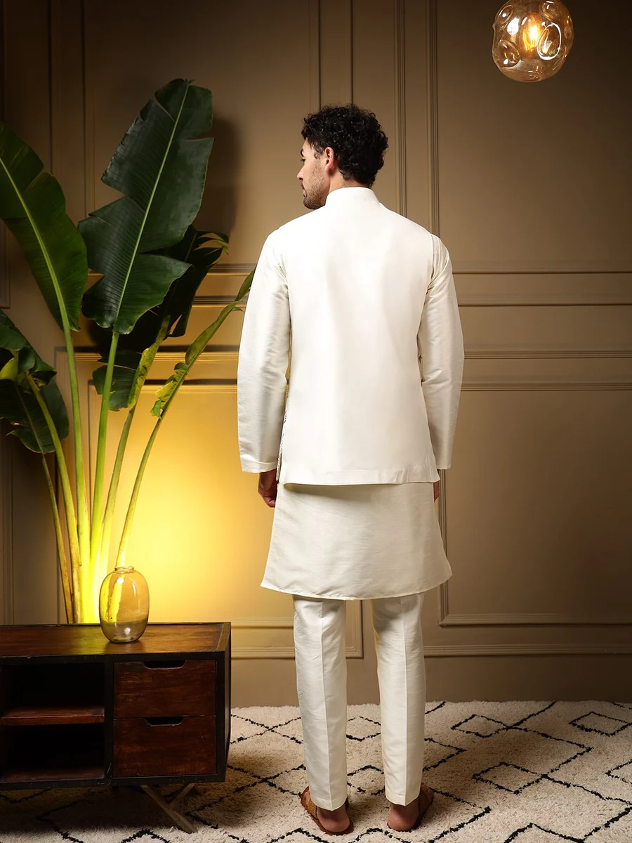 MODERN SILK PLAIN KURTA PAYJAMA WITH EMBROIDERY SEQUENCE WORK KOTI CREAM