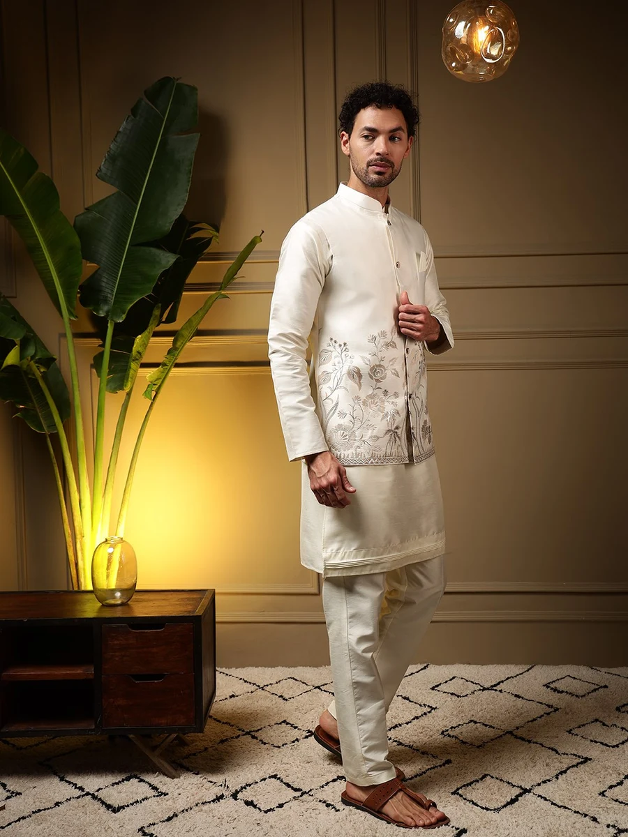 MODERN SILK PLAIN KURTA PAYJAMA WITH EMBROIDERY SEQUENCE WORK KOTI CREAM
