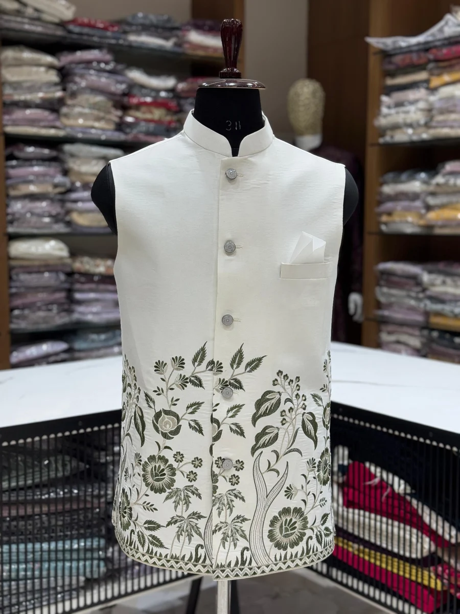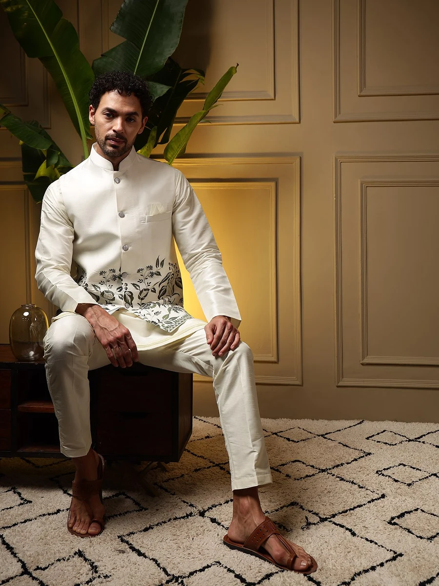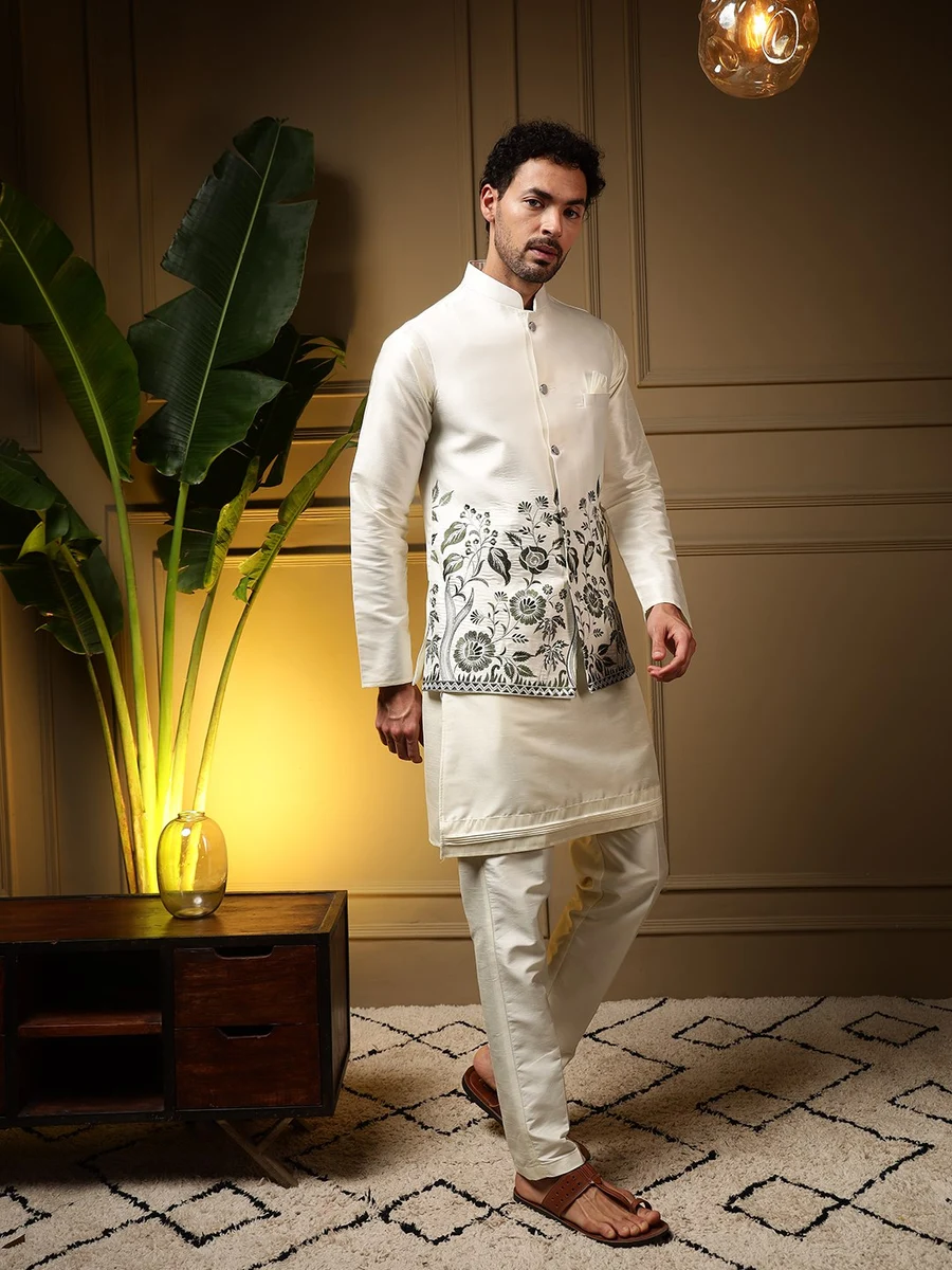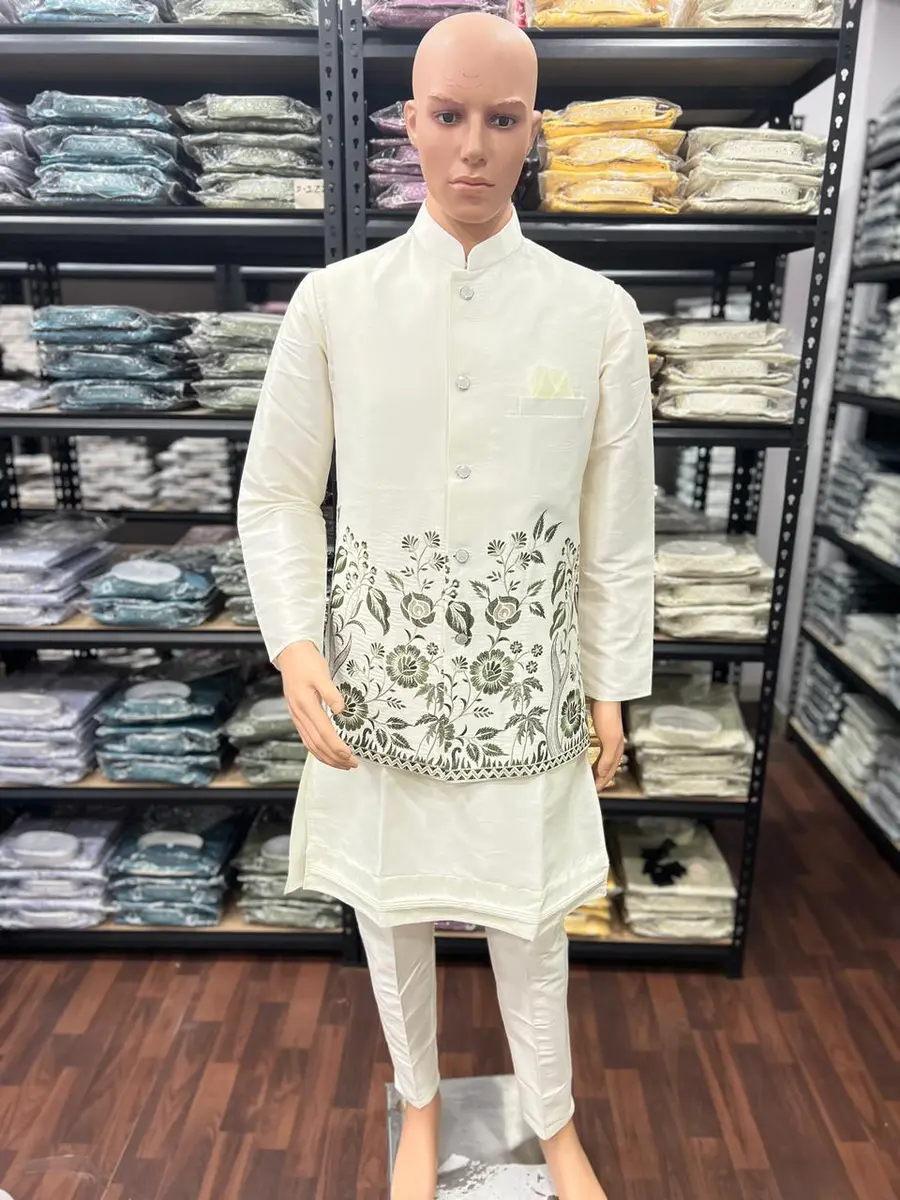 MODERN SILK PLAIN KURTA PAYJAMA WITH EMBROIDERY SEQUENCE WORK KOTI CREAM