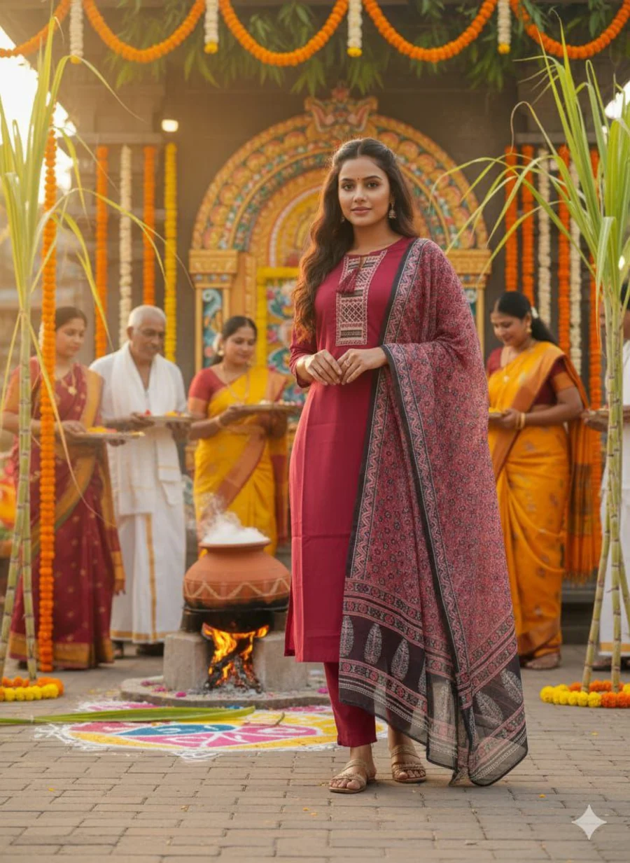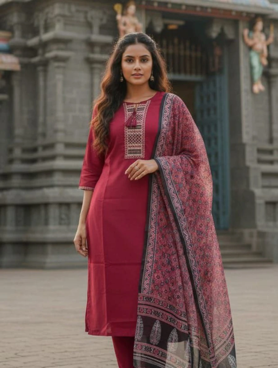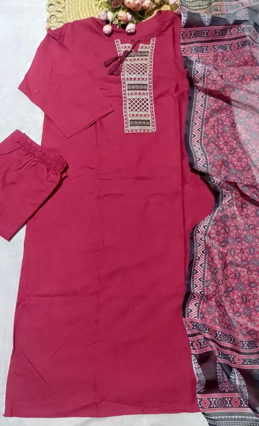 MODERN SLUB COTTON EMBROIDERY WORK TOP BOTTOM WITH DUPATTA MAROON