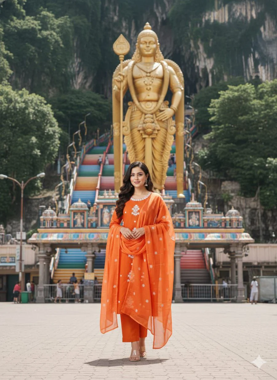 MODERN SLUB COTTON EMBROIDERY WORK TOP BOTTOM WITH DUPATTA ORANGE