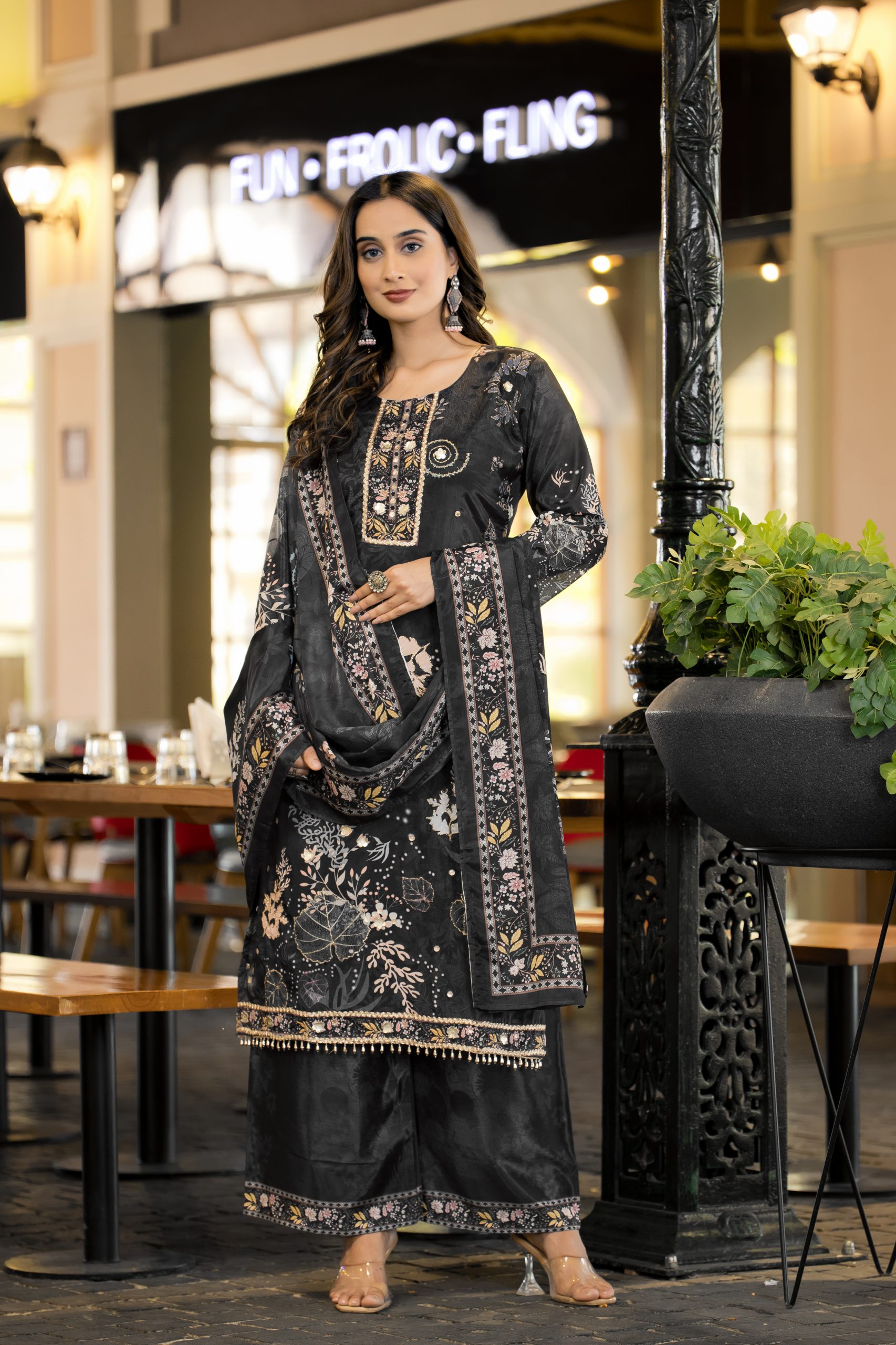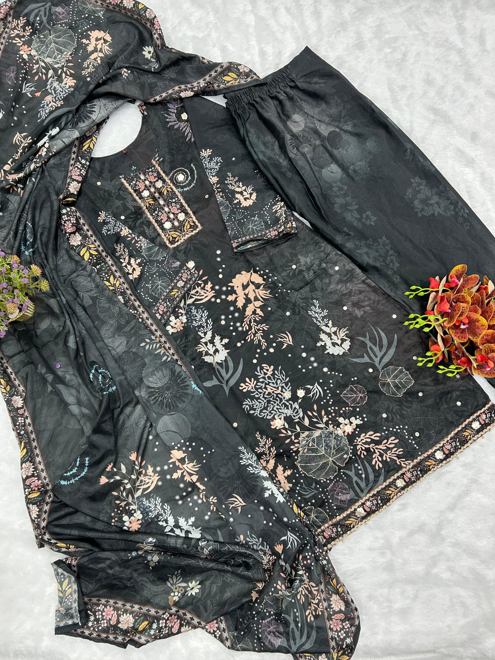 MODERN SOFT CHINON DIGITAL PRINT AND HANDWORK TOP BOTTOM WITH DUPATTA BLACK