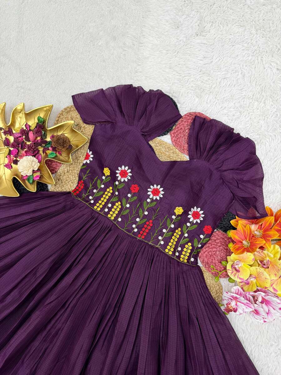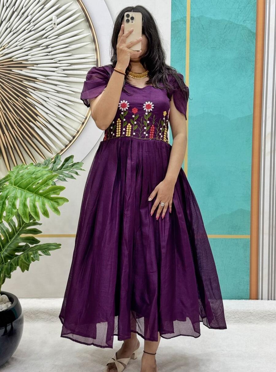 MODERN SOFT KOTA CHECKS THREAD WORK ONE PEICE DRESS PURPLE