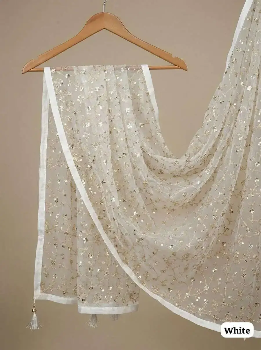 MODERN SOFT NET ZARI + SEQUENCE EMBROIDERY WORK ONLY DUPATTA WHITE
