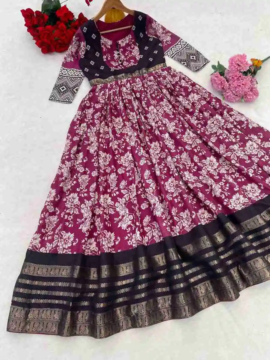 MODERN SOFT SILK KALAMKARI PRINT WITH WEAVING ZARI BORDER WORK GOWN PINK