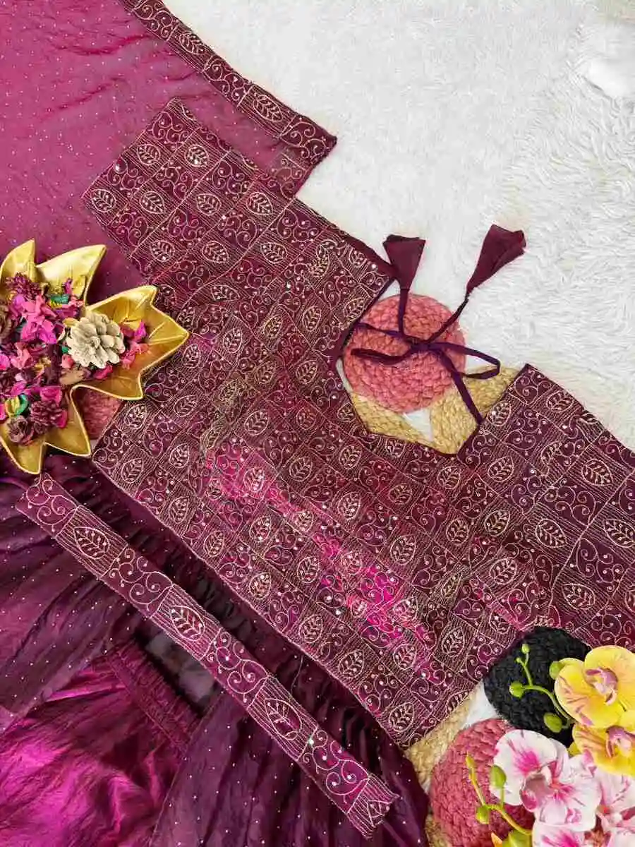 MODERN SPACE SILK SEQUENCE EMBROIDERY WORK LEHENGA CHOLI DUPATTA WITH EXTRA FRILL WINE