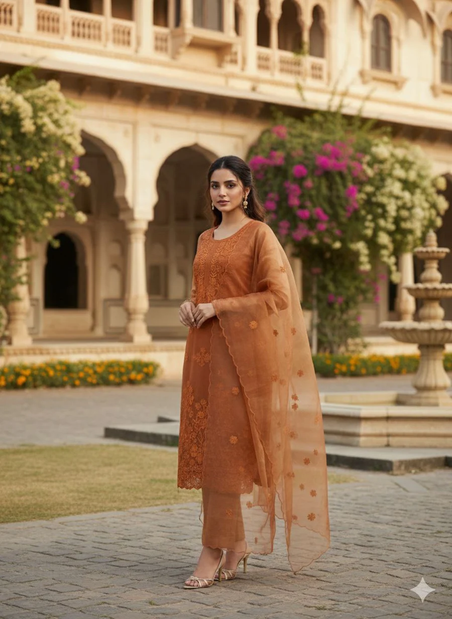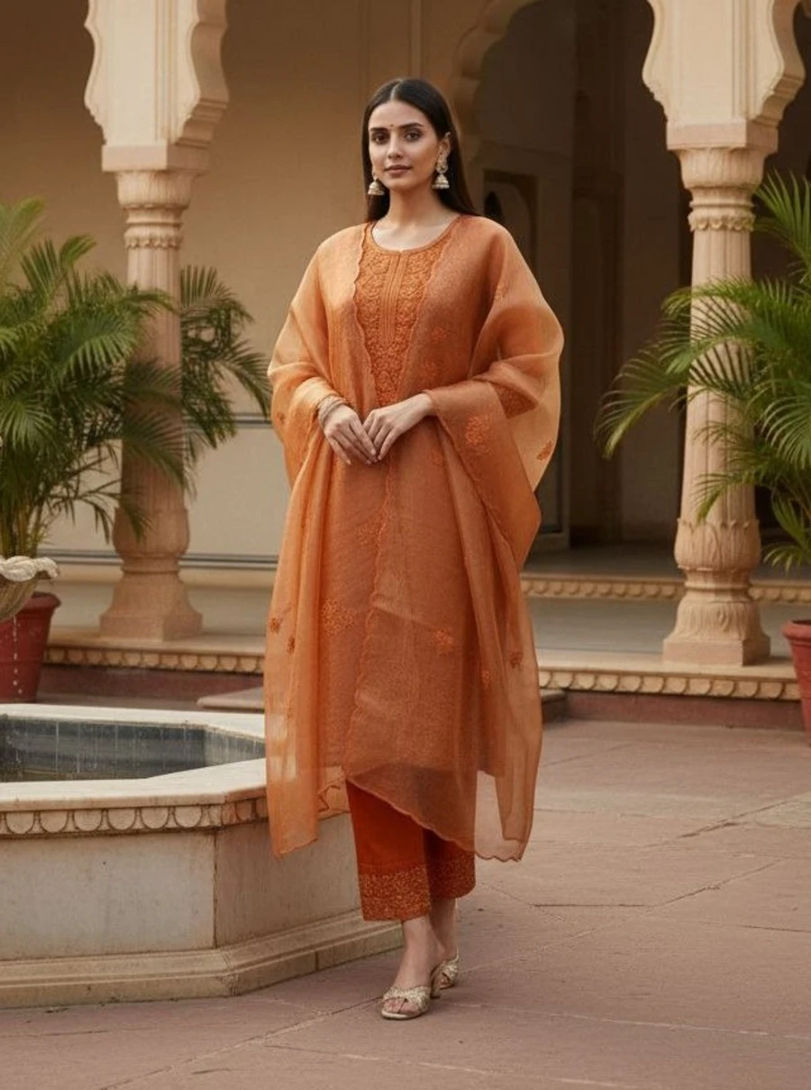 MODERN TWILL COTTON EMBROIDERY WORK TOP BOTTOM WITH DUPATTA ORANGE
