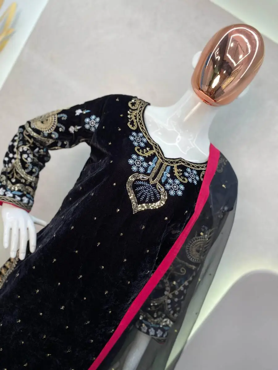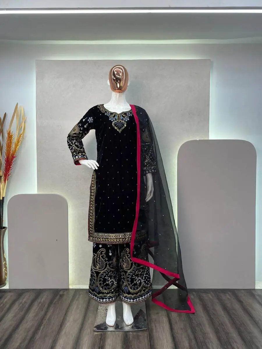 MODERN VELVET CODING SEQUENCE EMBROIDERY WORK TOP PALAZZO WITH DUPATTA BLACK