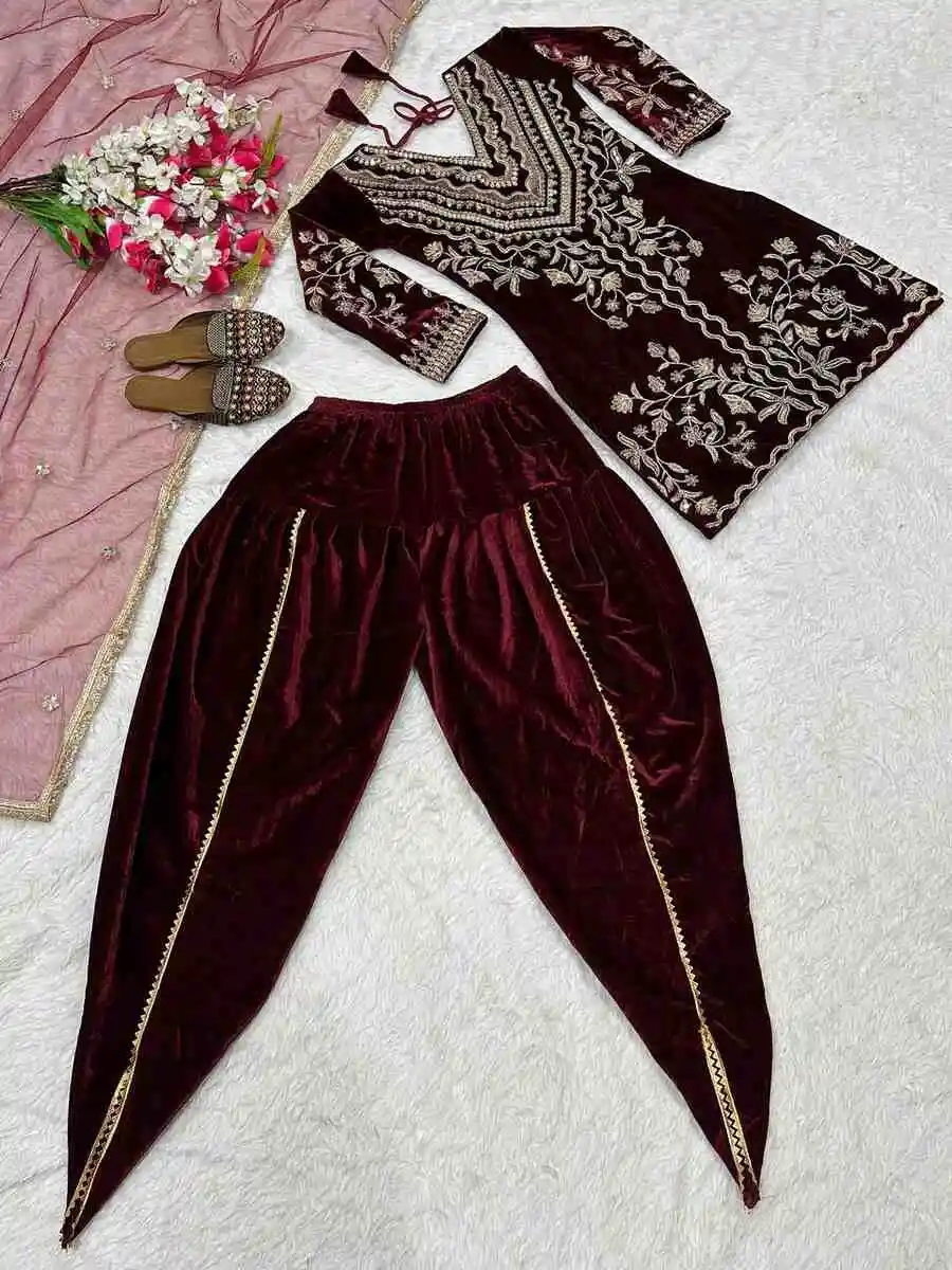 MODERN VELVET EMBROIDERY MULTI NEEDLE SEQUENCE WORK TOP DHOTI WITH DUPATTA MAROON