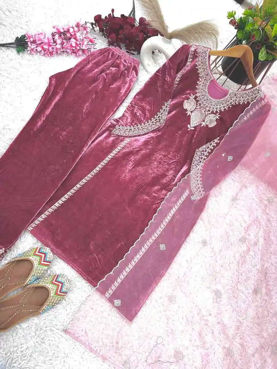 MODERN VELVET EMBROIDERY SEQUENCE WORK TOP BOTTOM WITH DUPATTA PINK