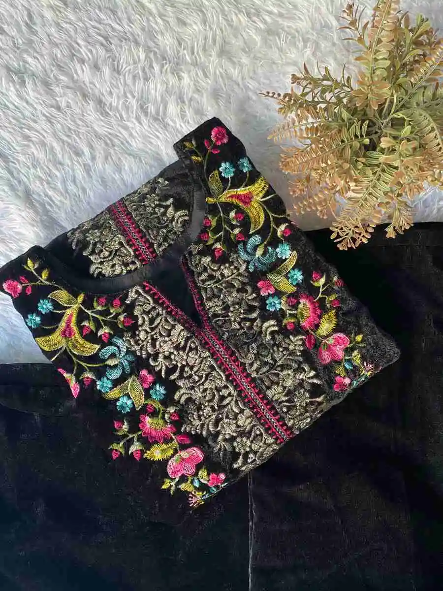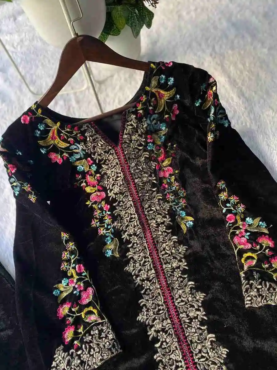 MODERN VELVET EMBROIDERY WORK CO-ORD SET BLACK