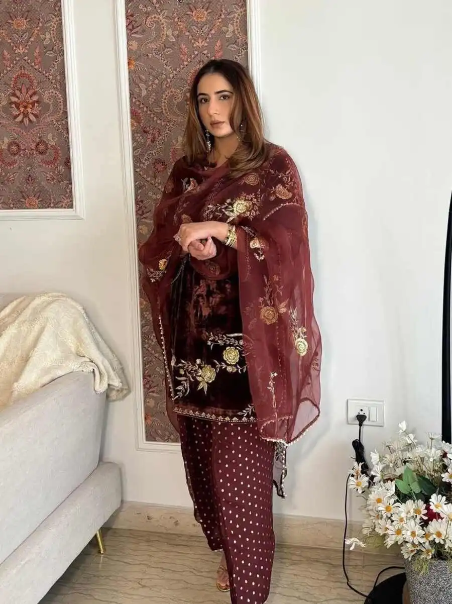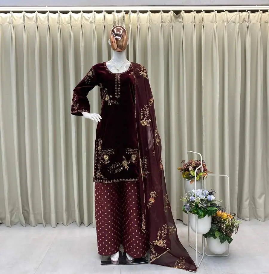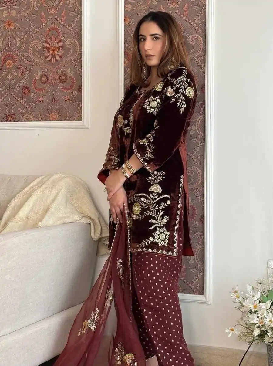 MODERN VELVET SEQUENCE EMBROIDERY WORK TOP BOTTOM WITH DUPATTA MAROON