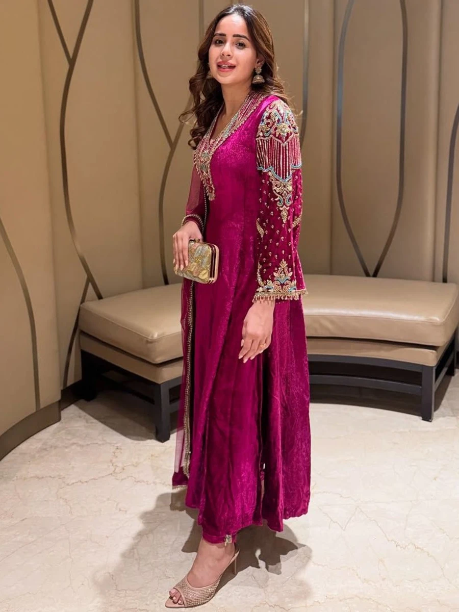 MODERN VELVET SEQUENCE & ZARI EMBROIDERY WORK & HANDWORK LACE WORK TOP BOTTOM WITH DUPATTA PINK