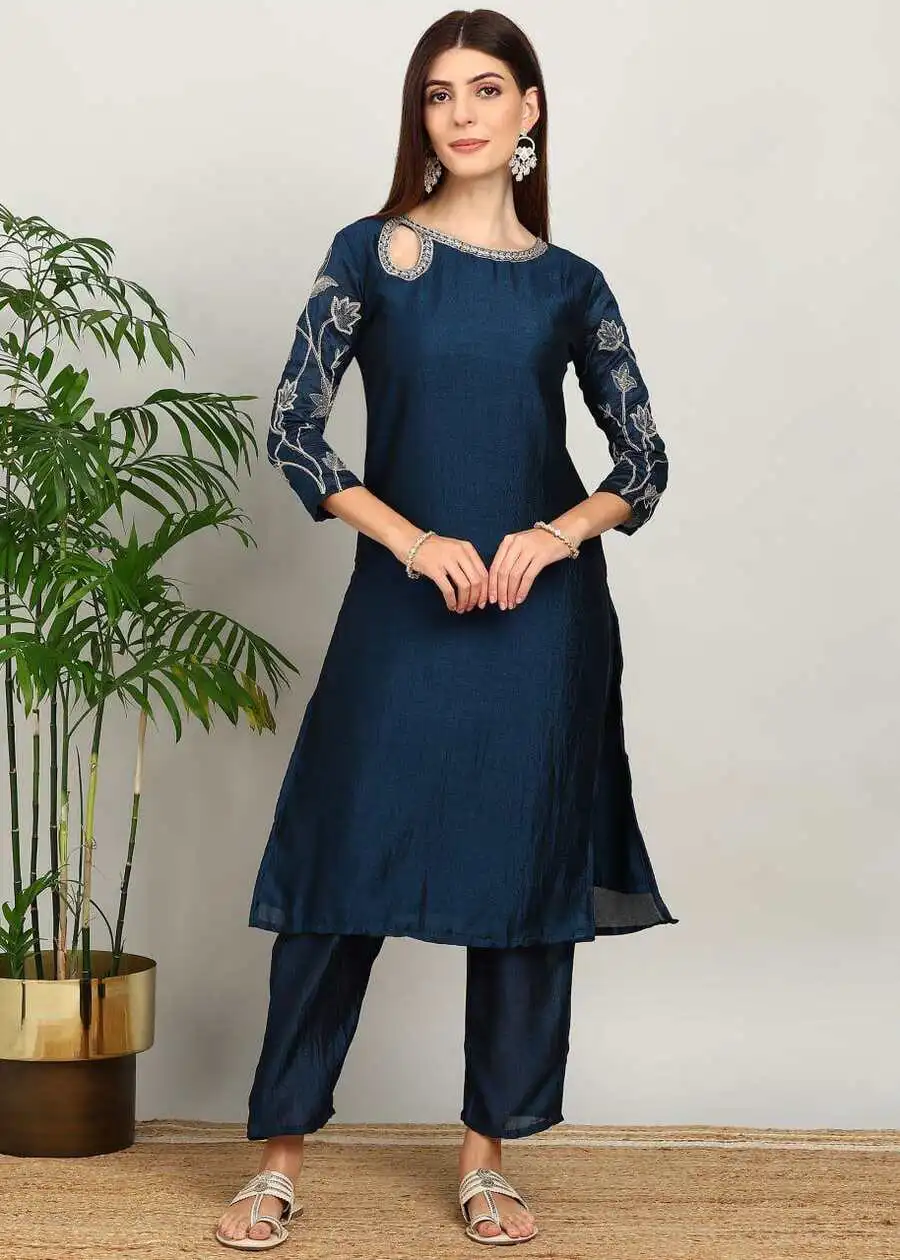 MODERN VICHITRA EMBROIDERY WORK TOP BOTTOM WITH DUPATTA NAVY BLUE