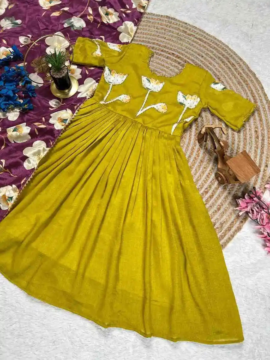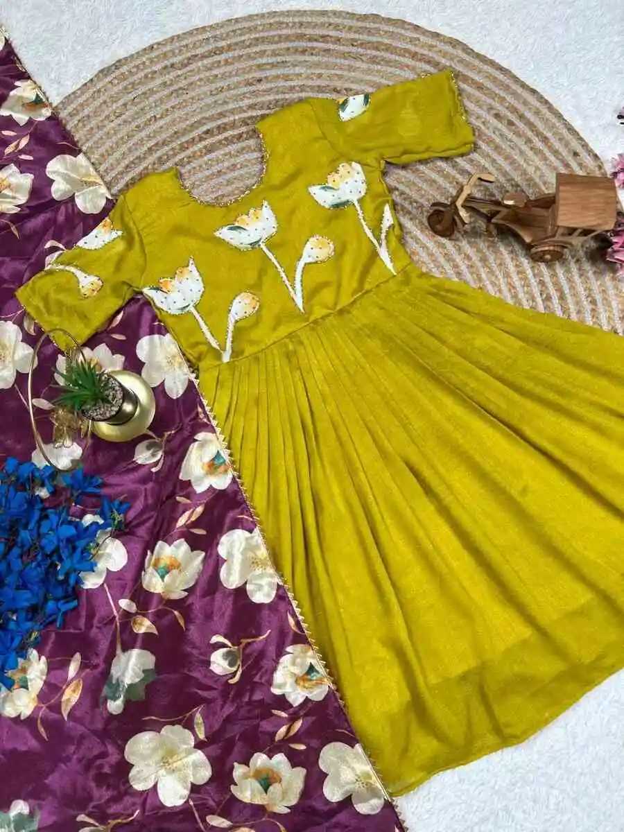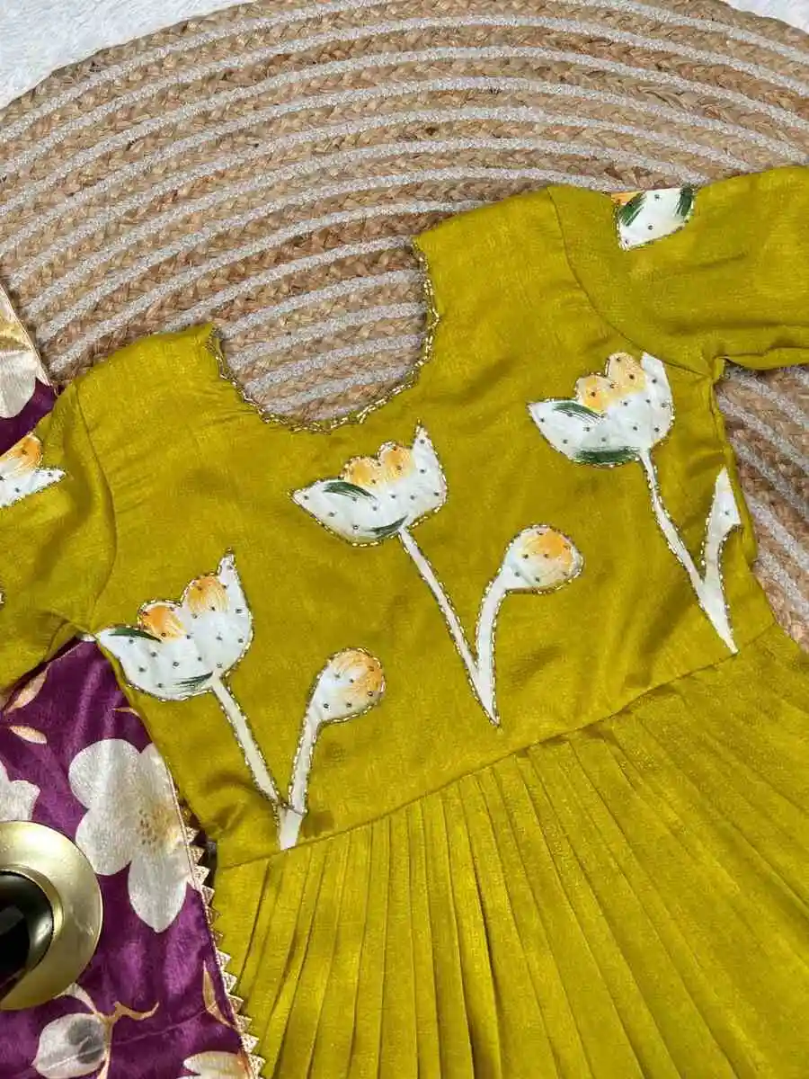 MODERN VICHITRA SILK HAND PAINTED WHIT MAGGAM WORK KID’S GOWN WITH DUPATTA LEMON