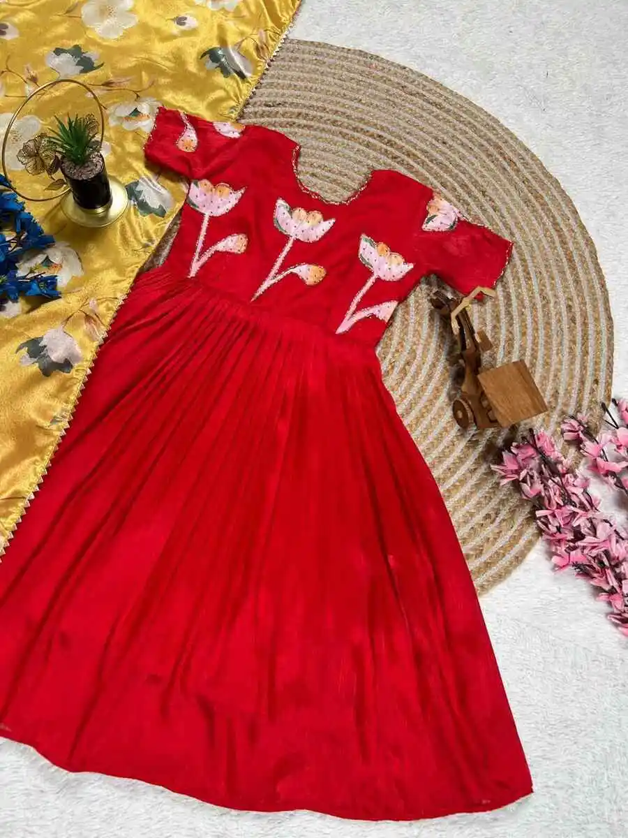MODERN VICHITRA SILK HAND PAINTED WHIT MAGGAM WORK KID’S GOWN WITH DUPATTA RED