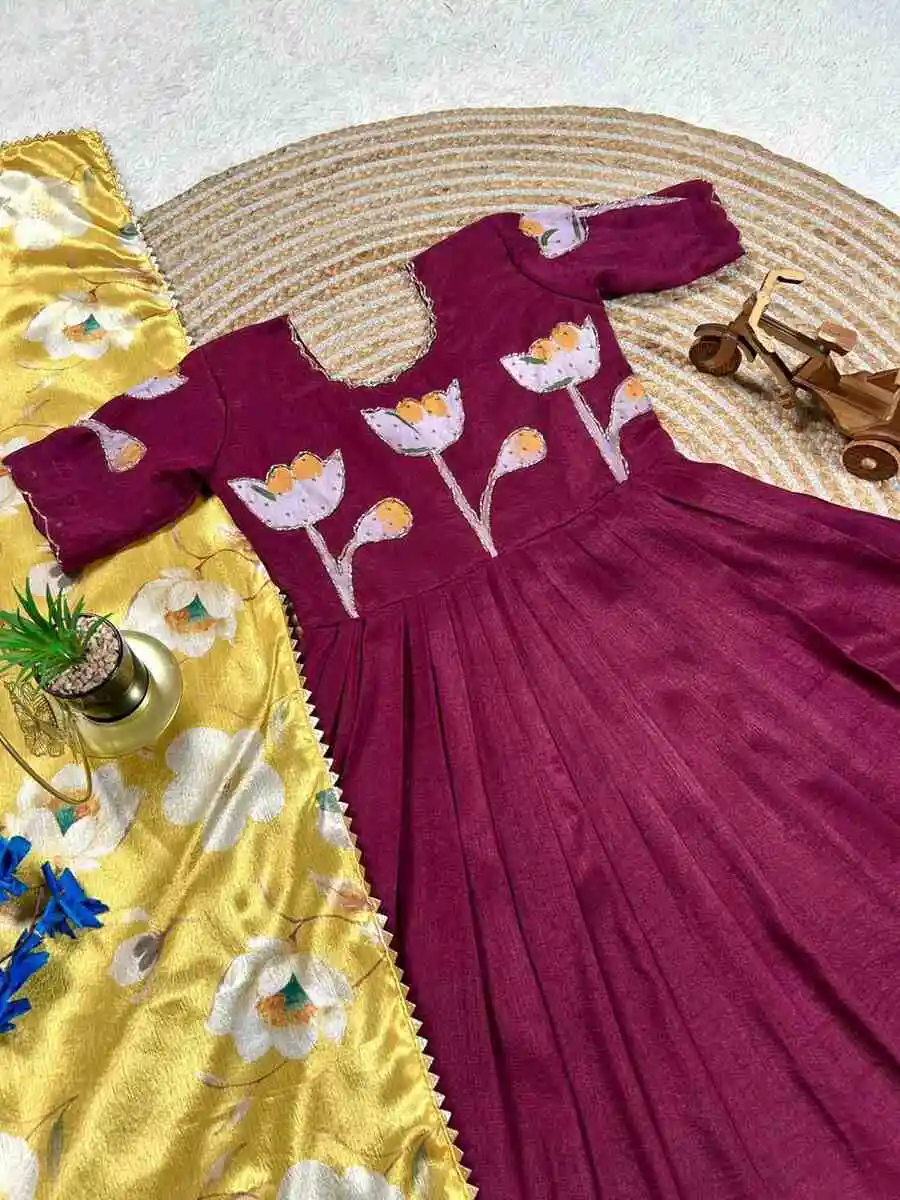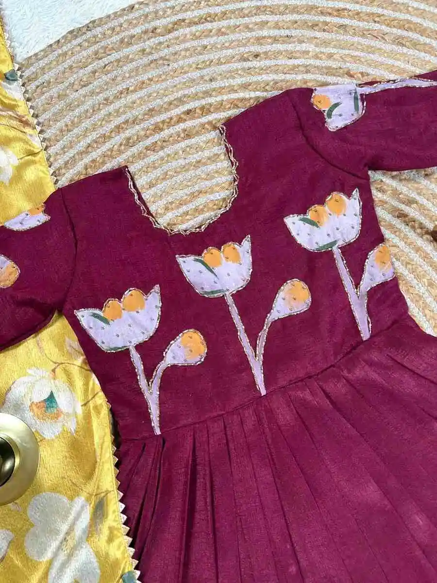 MODERN VICHITRA SILK HAND PAINTED WHIT MAGGAM WORK KID’S GOWN WITH DUPATTA WINE
