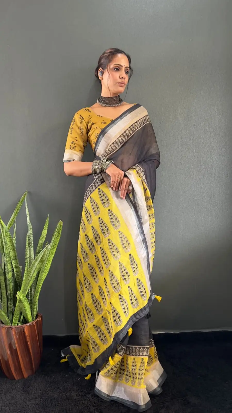 MOST PICKED LINEN SILK DIGITAL PRINT WORK READY TO WEAR SAREE WITH UNSTITCHED BLOUSE YELLOW AND BLACK