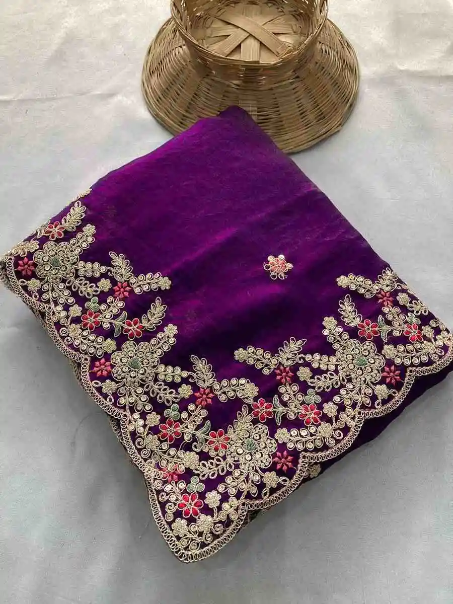 MOST PICKED SPACE SILK EMBROIDERY CUTWORK WORK AARC BORDER WORK SAREE WITH UNSTITCHED BLOUSE PURPLE