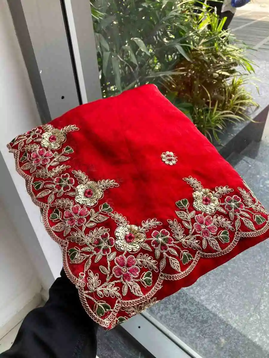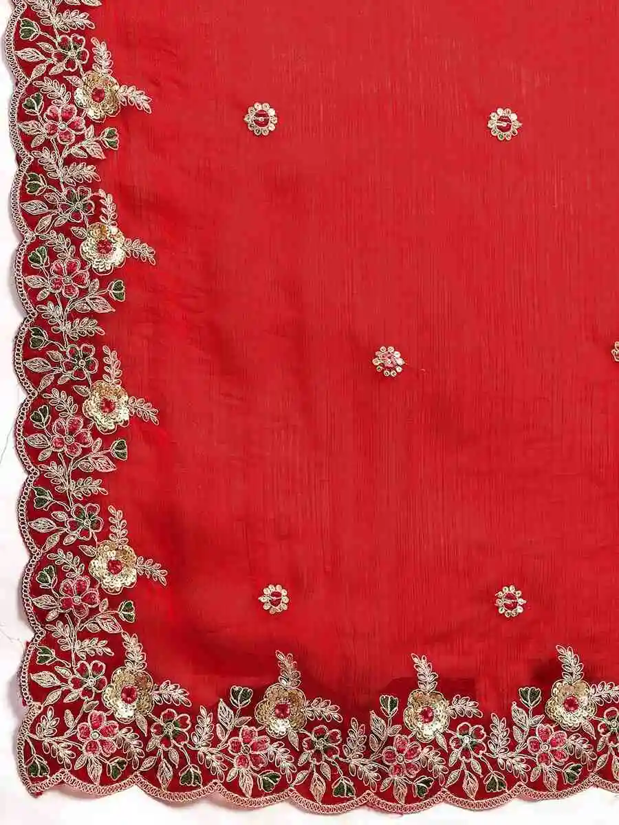 MOST PICKED SPACE SILK EMBROIDERY CUTWORK WORK AARC BORDER WORK SAREE WITH UNSTITCHED BLOUSE RED