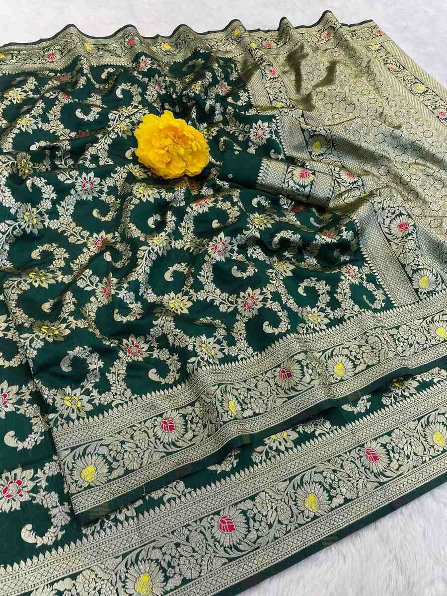NEW ARRIVAL BANARASI SILK FLOWERS AND MINA WITH ZARI WEAVING BORDER WORK SAREE WITH UNSTITCHED BLOUSE GREEN