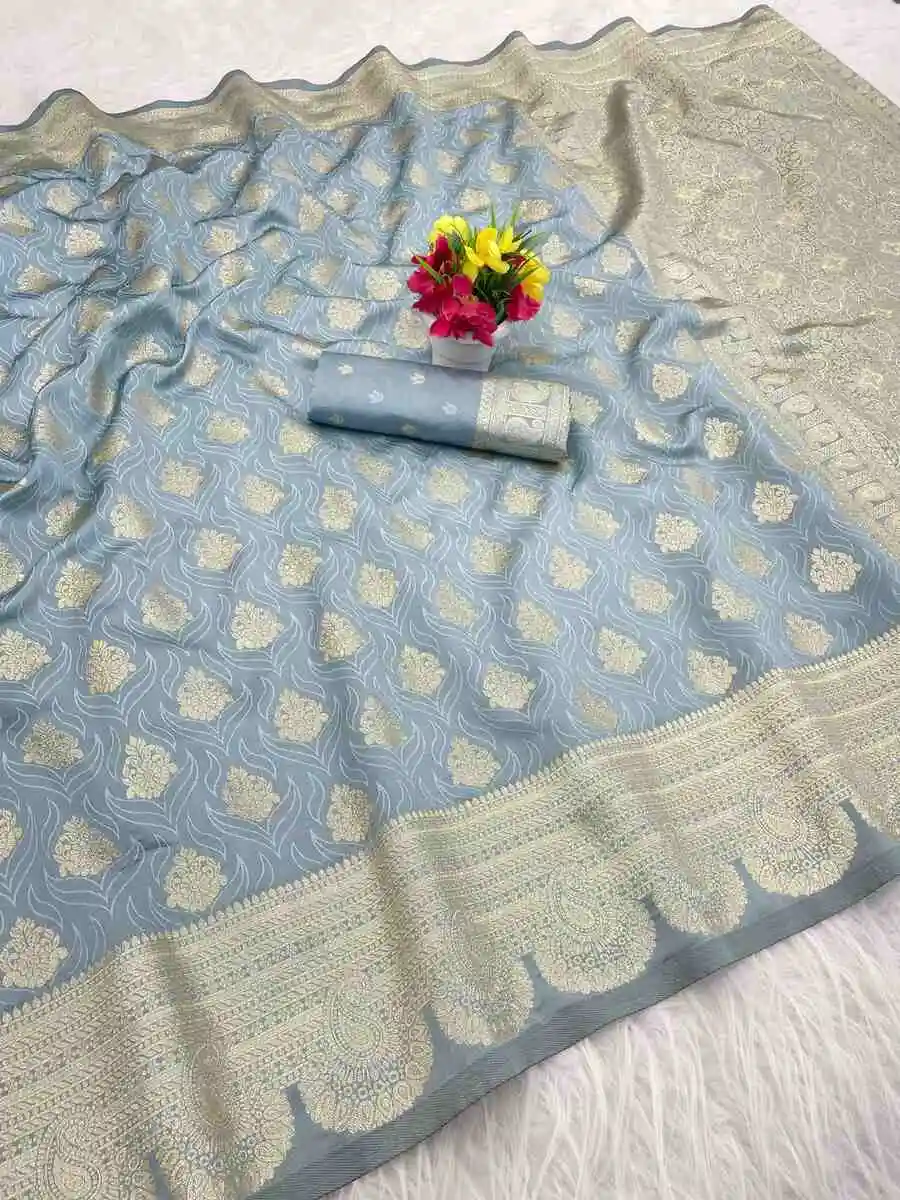 NEW ARRIVAL BANARASI SILK FLOWERS AND MINA & ZARI WEAVING WORK SAREE WITH UNSTITCHED BLOUSE GREY