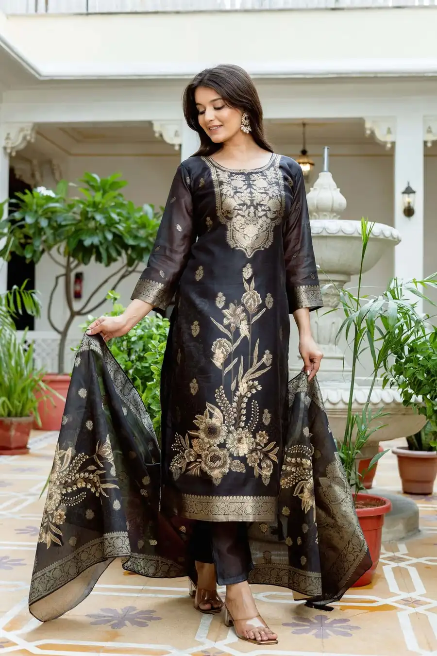 NEW ARRIVAL CHANDERI COTTON JACQUARD WORK TOP BOTTOM WITH DUPATTA BLACK