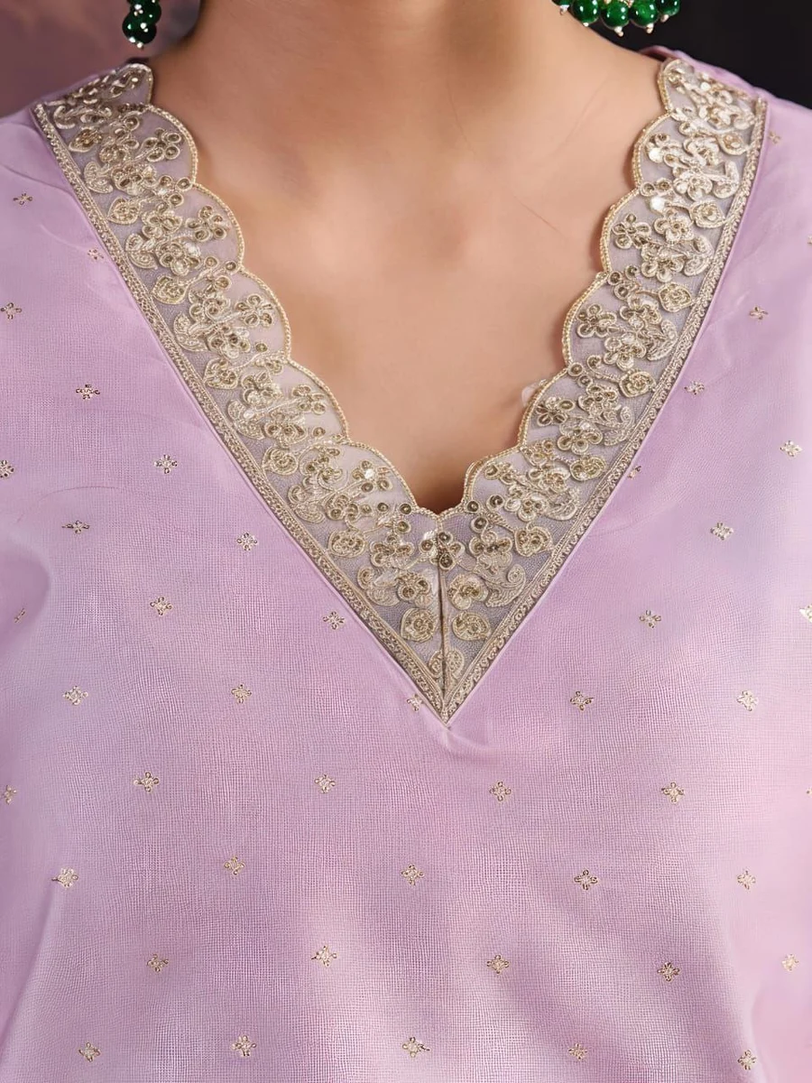 NEW ARRIVAL CHANDERI SILK EMBROIDERY SEQUENCE WORK TOP BOTTOM WITH DUPATTA LAVENDER