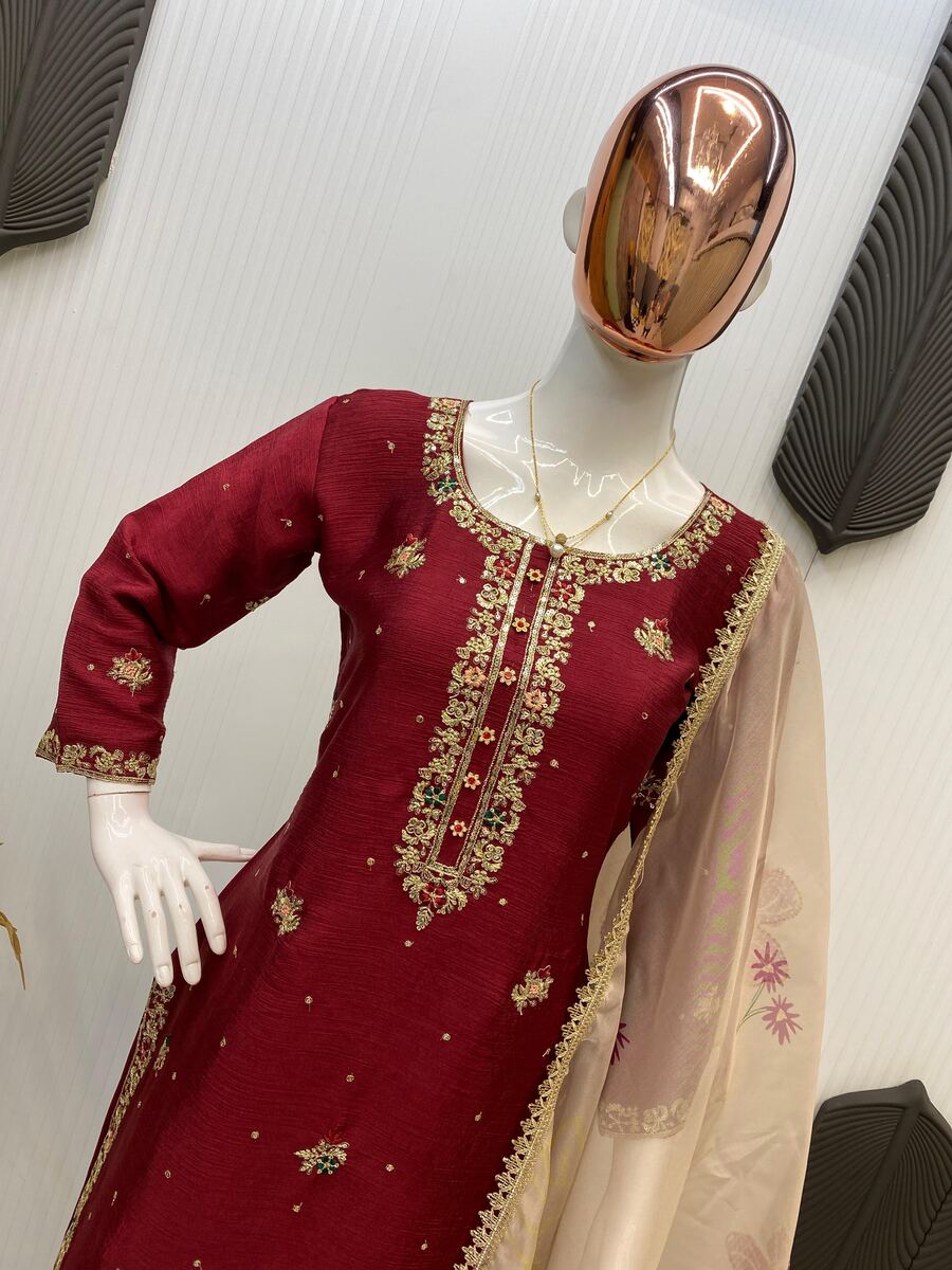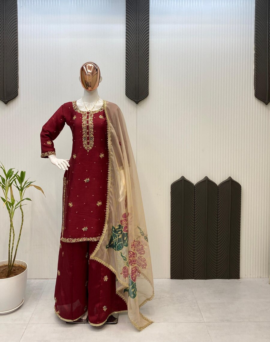 NEW ARRIVAL CHINON SEQUENCE EMBROIDERY WORK TOP PALAZZO WITH DUPATTA MAROON