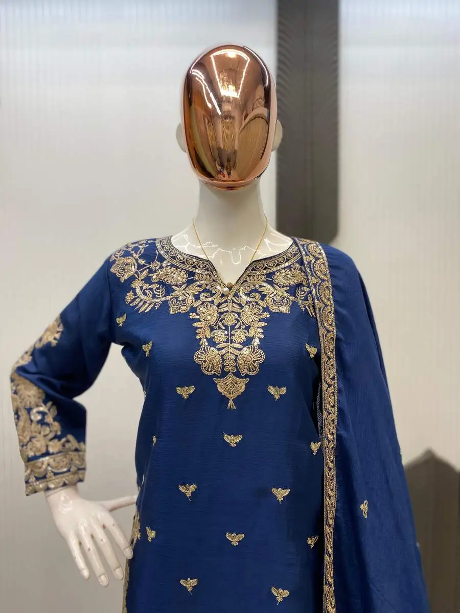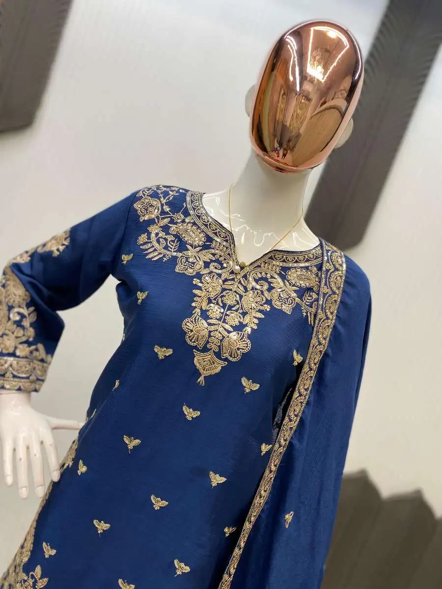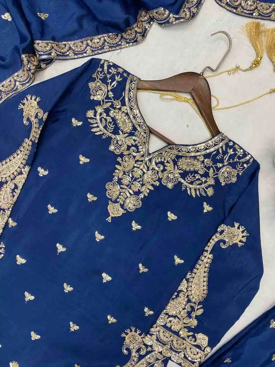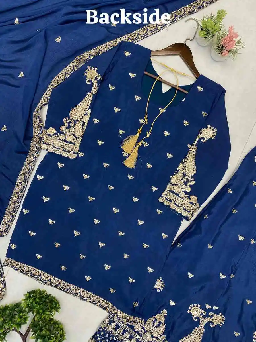 NEW ARRIVAL CHINON SEQUENCE EMBROIDERY WORK TOP PALAZZO WITH DUPATTA NAVY BLUE