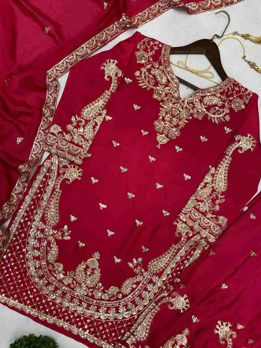 NEW ARRIVAL CHINON SEQUENCE EMBROIDERY WORK TOP PALAZZO WITH DUPATTA RANI