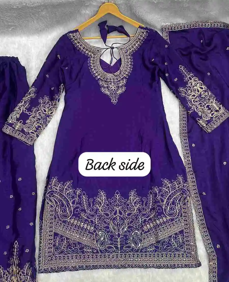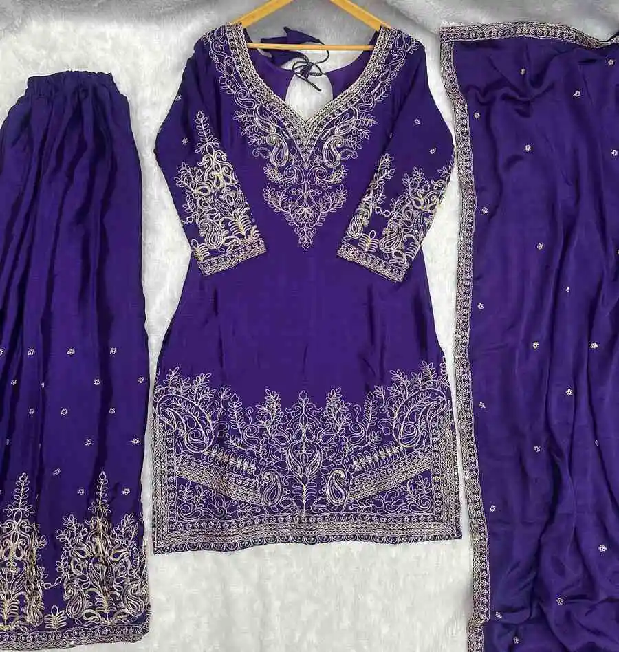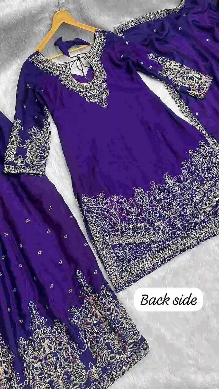 NEW ARRIVAL CHINON SILK EMBROIDERY SEQUENCE CODING ZARI WORK TOP PALAZZO WITH DUPATTA PURPLE