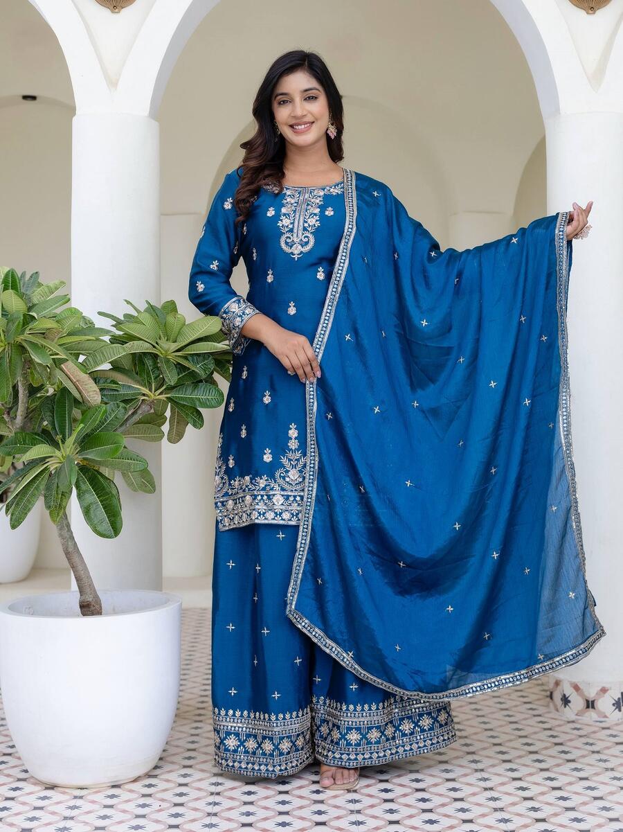 NEW ARRIVAL CHINON SILK EMBROIDERY SEQUENCE WORK TOP PALAZZO WITH DUPATTA BLUE