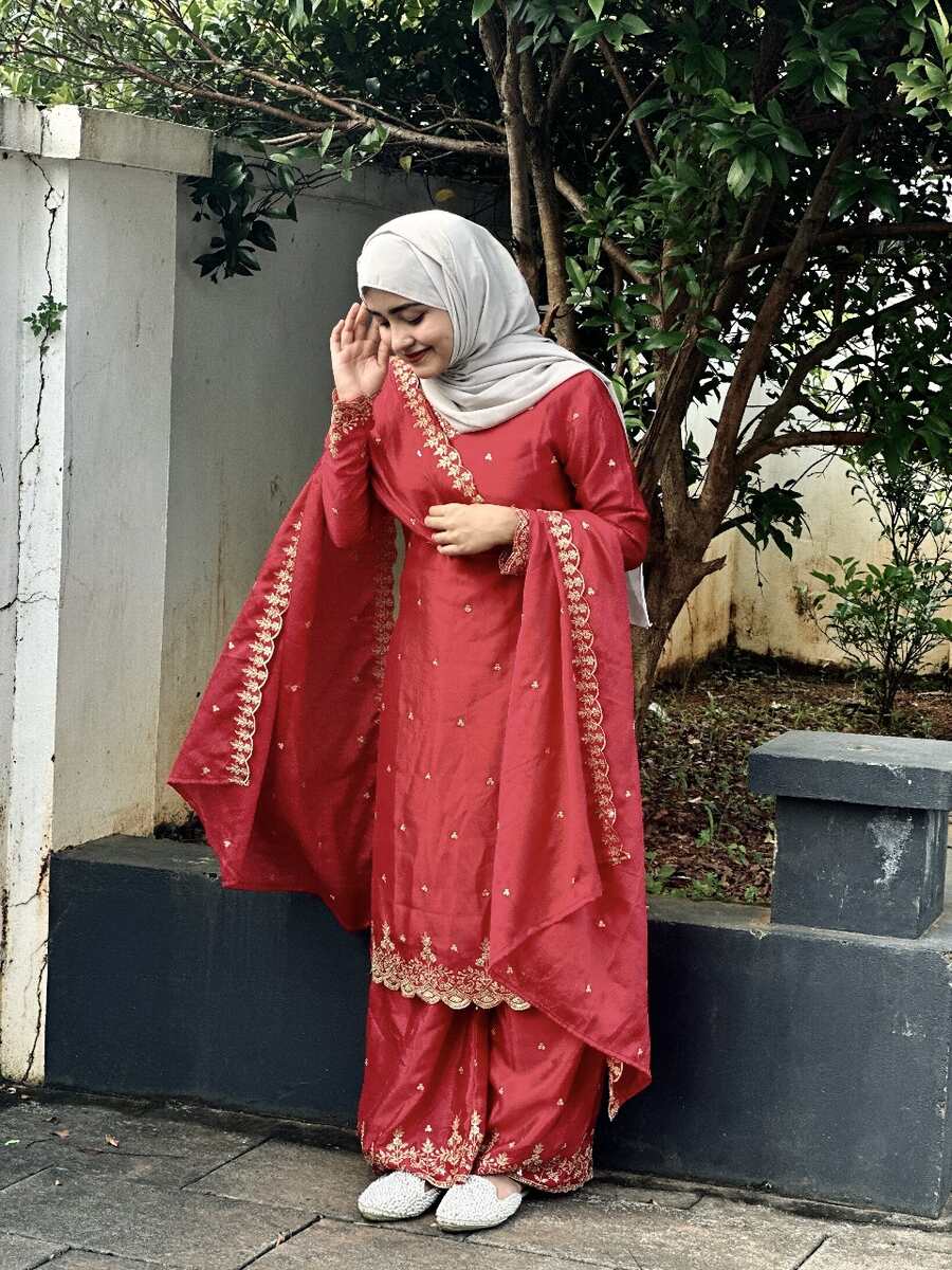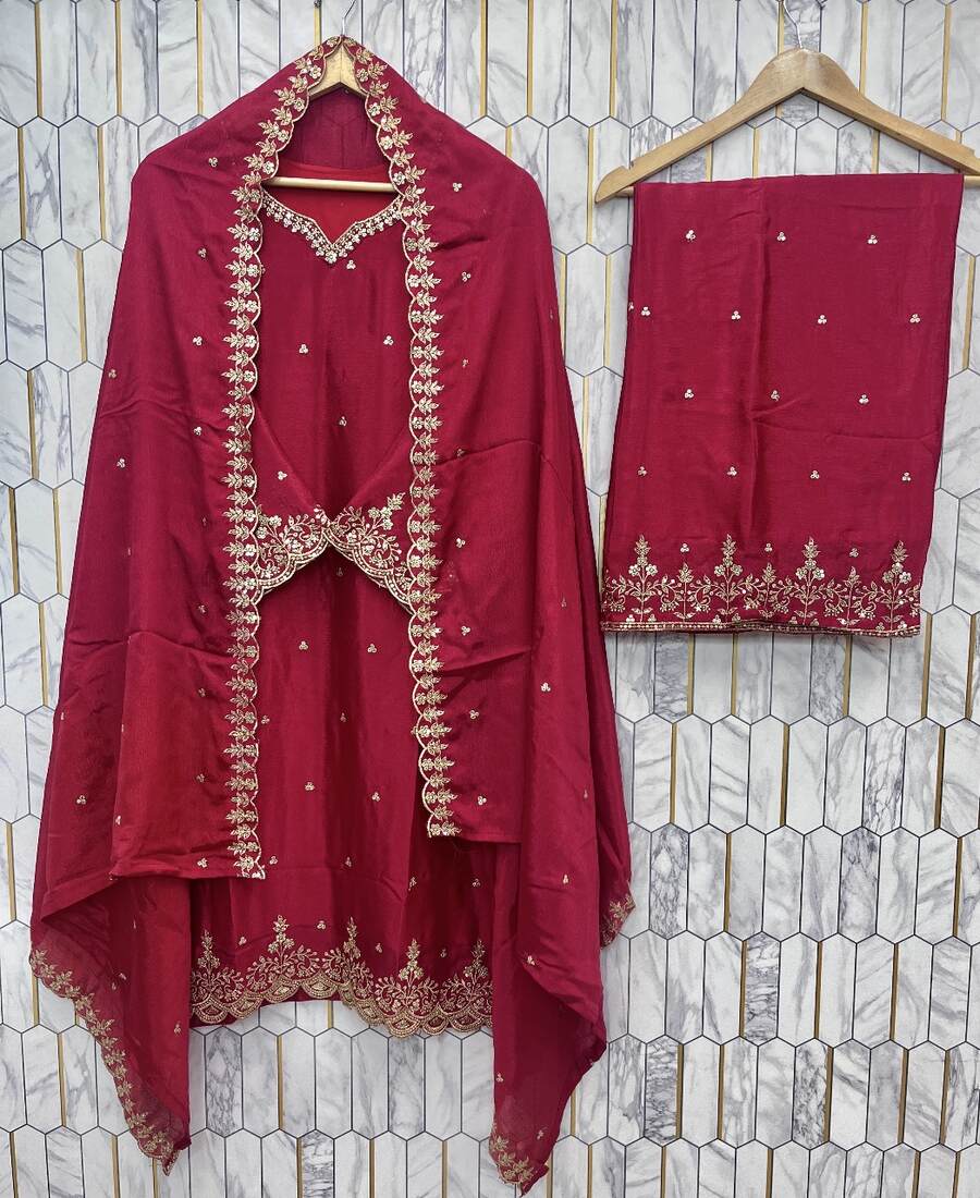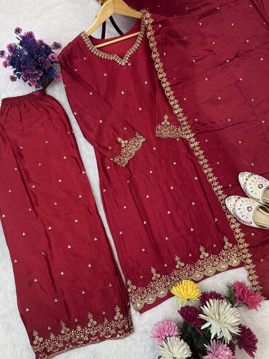 NEW ARRIVAL CHINON SILK EMBROIDERY SEQUENCE WORK TOP PALAZZO WITH DUPATTA RED