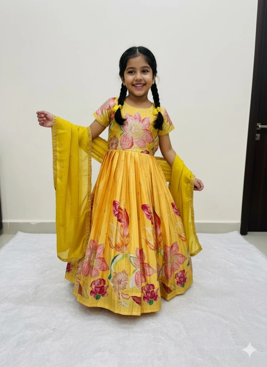 NEW ARRIVAL CHINON SILK POSITION PRINT FOIL WORK KID’S GOWN WITH DUPATTA YELLOW