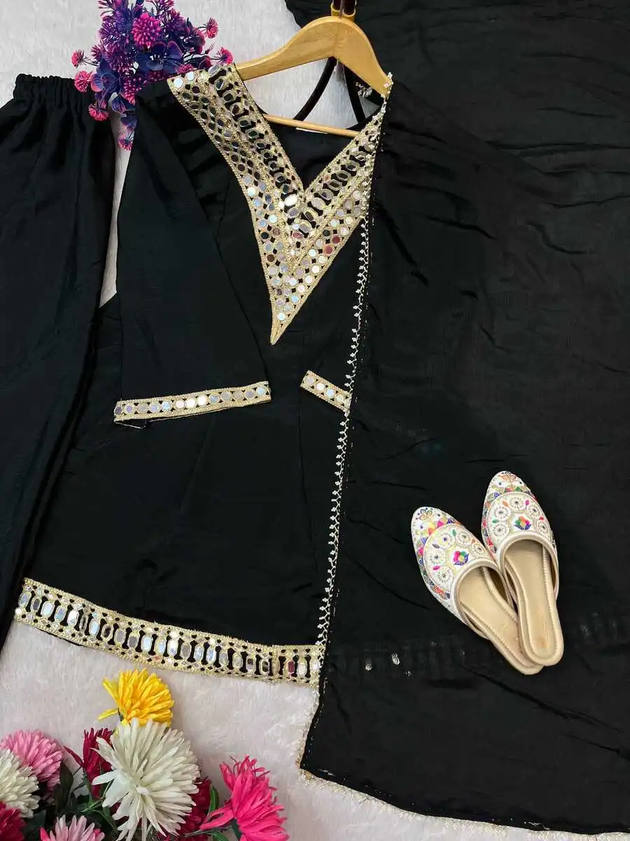 NEW ARRIVAL CHINON SILK REAL MIRROR WORK TOP PALAZZO WITH DUPATTA BLACK